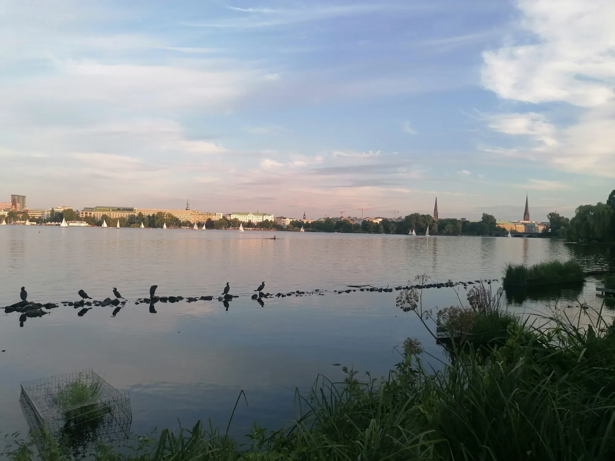 Ce midi, nous avons pris le temps d’élaborer notre stratégie pour aborder la géante Hambourg. Nous avons choisi un stationnement payant mais bien situé, 10€ la journée, dans un quartier chic et tranquille, une impasse qui mène à la promenade qui fait le tour du lac Außenalster.