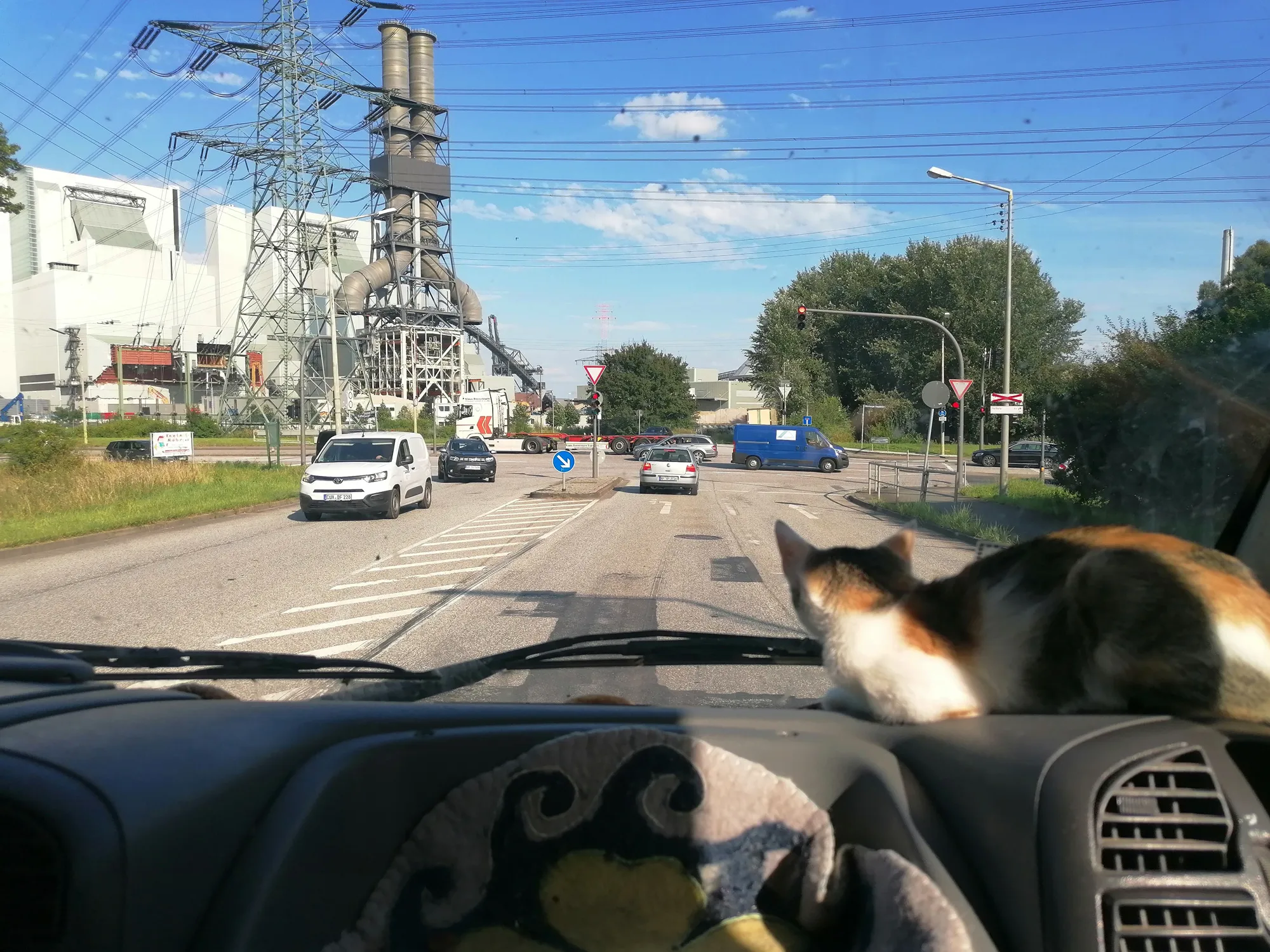Il nous reste 2h30 de route pour rejoindre Buxtehude, 2h30 d’autoroute en travaux et chargé de camions. Nous trouvons un stationnement dans un quartier chic, à l’ombre de grands arbres pour que Charlotte reste au frais. Pour l’instant elle ne comprend pas qu’elle n’a pas le droit de sortir et se faufile dehors dès qu’elle peut. C’est la première fois que nous la laissons seule à l’intérieur. Litière accessible, un peu de pâtée pour rendre le moment plus agréable, et nous la quittons.