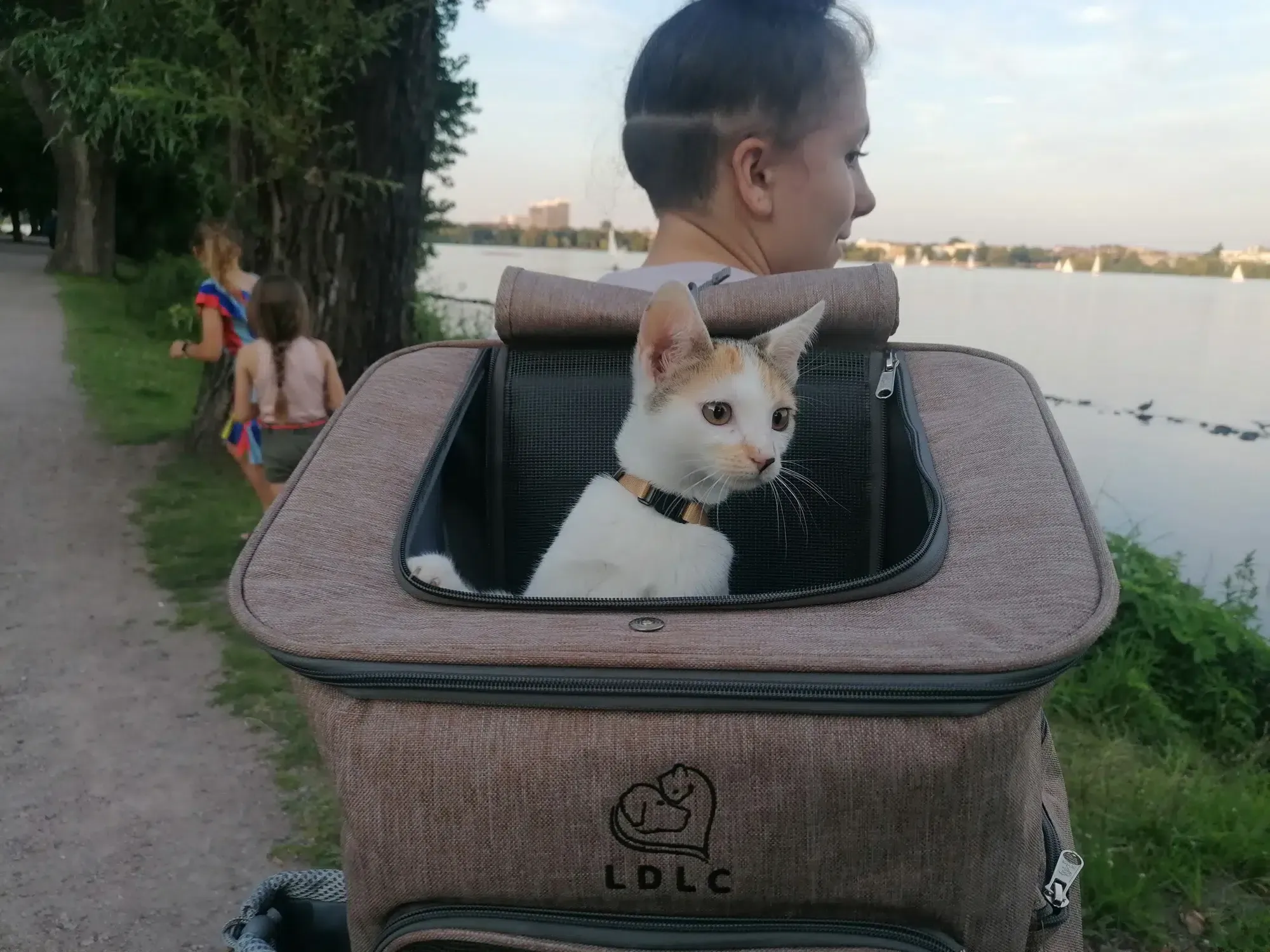 Puis nous partons profiter de la promenade au bord du lac au crépuscule, avec Charlotte cette fois-ci, nous avons investi dans un sac à dos pour chat. Ça fait plusieurs fois qu’on l’utilise, elle l’identifie déjà comme un refuge. La promenade est très fréquentée, vélo, coureurs, marcheurs et chiens. Il fait bon, le ciel est doux. Nous nous arrêtons dans un parc pour laisser Charlotte explorer. Elle sort de son sac tranquillement et prudemment. Capucine la tiens par une laisse à rallonge que nous lui avons bricolée. Elle papote fièrement avec 3 minettes allemandes en adoration devant la scène « sooo cuuuuuute ».