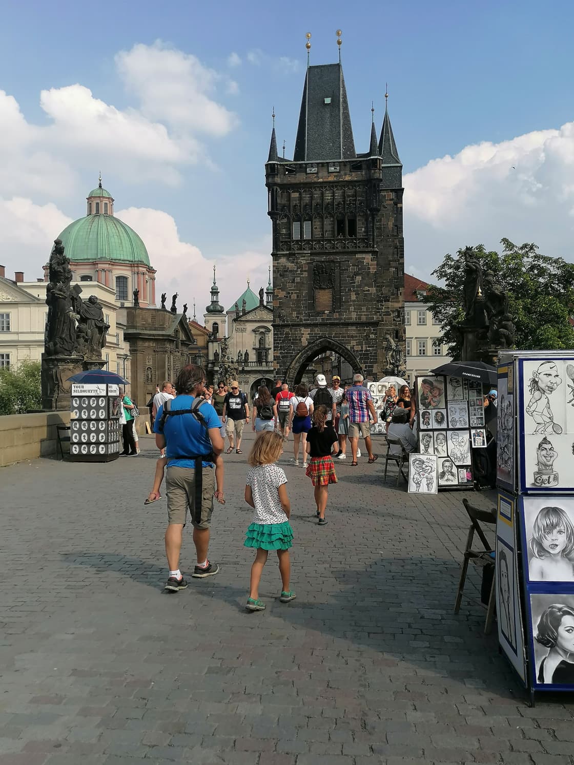 Nous continuons notre chemin vers le fleuve, la Vltava auprès duquel nous trouvons quelques parcs et fontaines pour une pause fraîcheur. Une mamie lance d’une main des graines à toute une petite famille de canards, tout en faisant s’éloigner les pigeons à coups de pieds. Scène adorable et amusante. Elle donne trois poignées de graines aux filles, et se retire pour s’acharner sur ces pauvres pigeons. Nous pique-niquons un peu plus, à l’ombre d’un parc doté de jeux d’enfants. Puis prenons un café et un petit dessert sur une jolie terrasse ombragée. Petit, cela dépend pour qui…