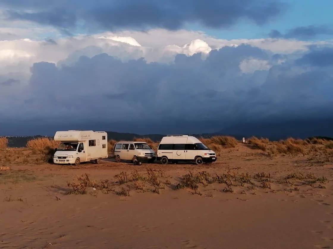 Google nous amène sur un chemin rural, par endroits bien boueux. Ça passe ? Ça devrait. Le gros Emile-Pat’ passe en dandinant amplement, les vans suivent. Émilie n’a vraiment peur de rien. Ce spot ? Non. Trop de déchets. Impossible. Et en plus on ne voit même pas la mer. J’inspecte Google earth et je vois un peu plus loin un chemin qui s’avance entre les dunes. Nous serons plus près de la plage. Ok. L’endroit est sympa mais jonché de déchets comme partout. « Les enfants, on ramasse les déchets ? Ooouuuaaiiiiiisss ! » Joie générale. Si vous ne savez pas comment occuper un enfant un mercredi après midi, trouvez une place sale et ramassez des déchets. Ils seront les plus heureux du monde. Heureux, oui. Équipés de sacs plastiques faisant office de gants improvisés, tout le monde s’affaire passionnément. Heureux et en colère. « Si je trouve celui ou celle qui a fait ça, il va passer un sale quart d’heure ! » me dit Léonie. Plus tard, lorsqu’elle écrira son carnet de voyage, au paragraphe « En quoi est-tu reconnaissant-e aujourd’hui ? » Elle écrira « Céline ». « Que veux-tu dire, Léonie ? Ce serait bien que tu développes, lui demande sa maman. C’est parce qu’elle m’a permis de ramasser les déchets. »