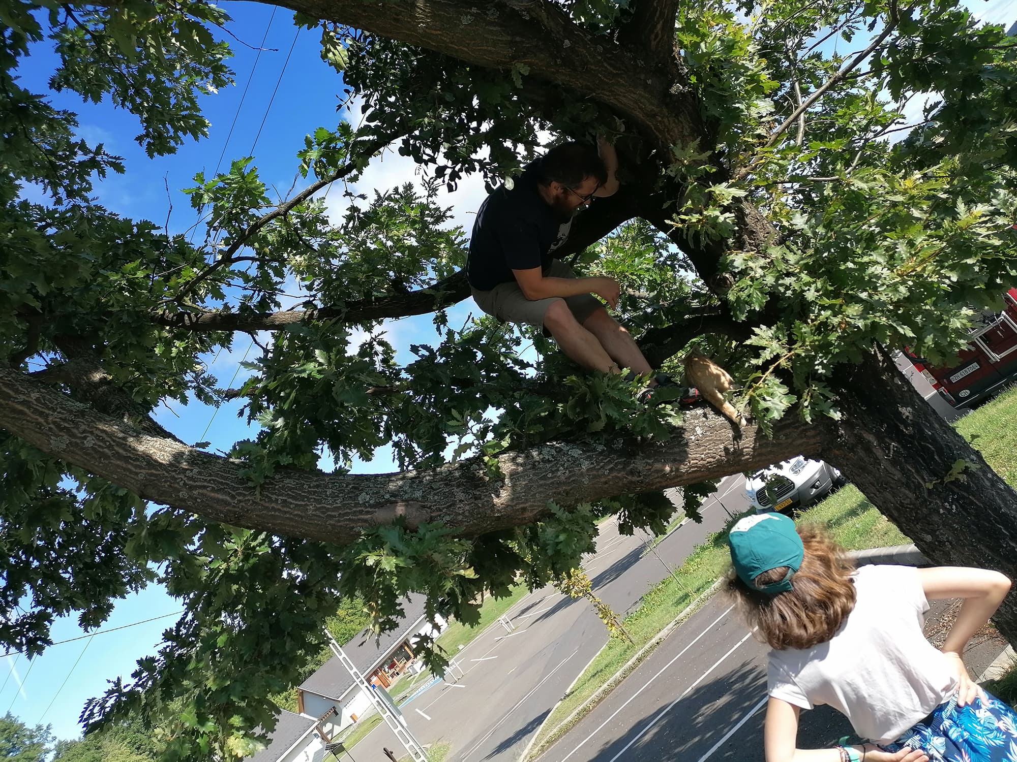 Lundi 2 août. Après un tour dans le moteur d’à côté, nous retrouvons le chat dans l’arbre de derrière. Pierre doit grimper pour récupérer son matou. Sport du matin.