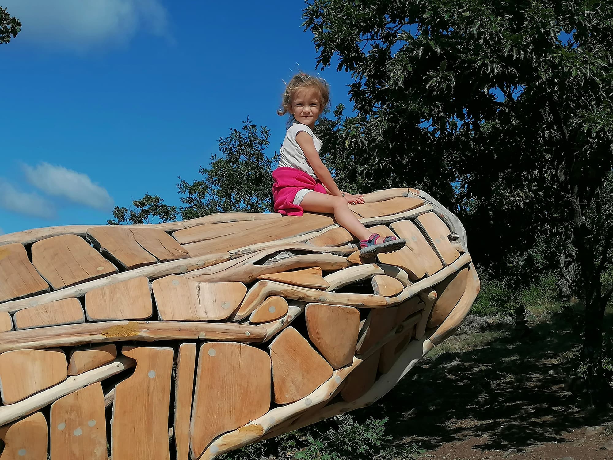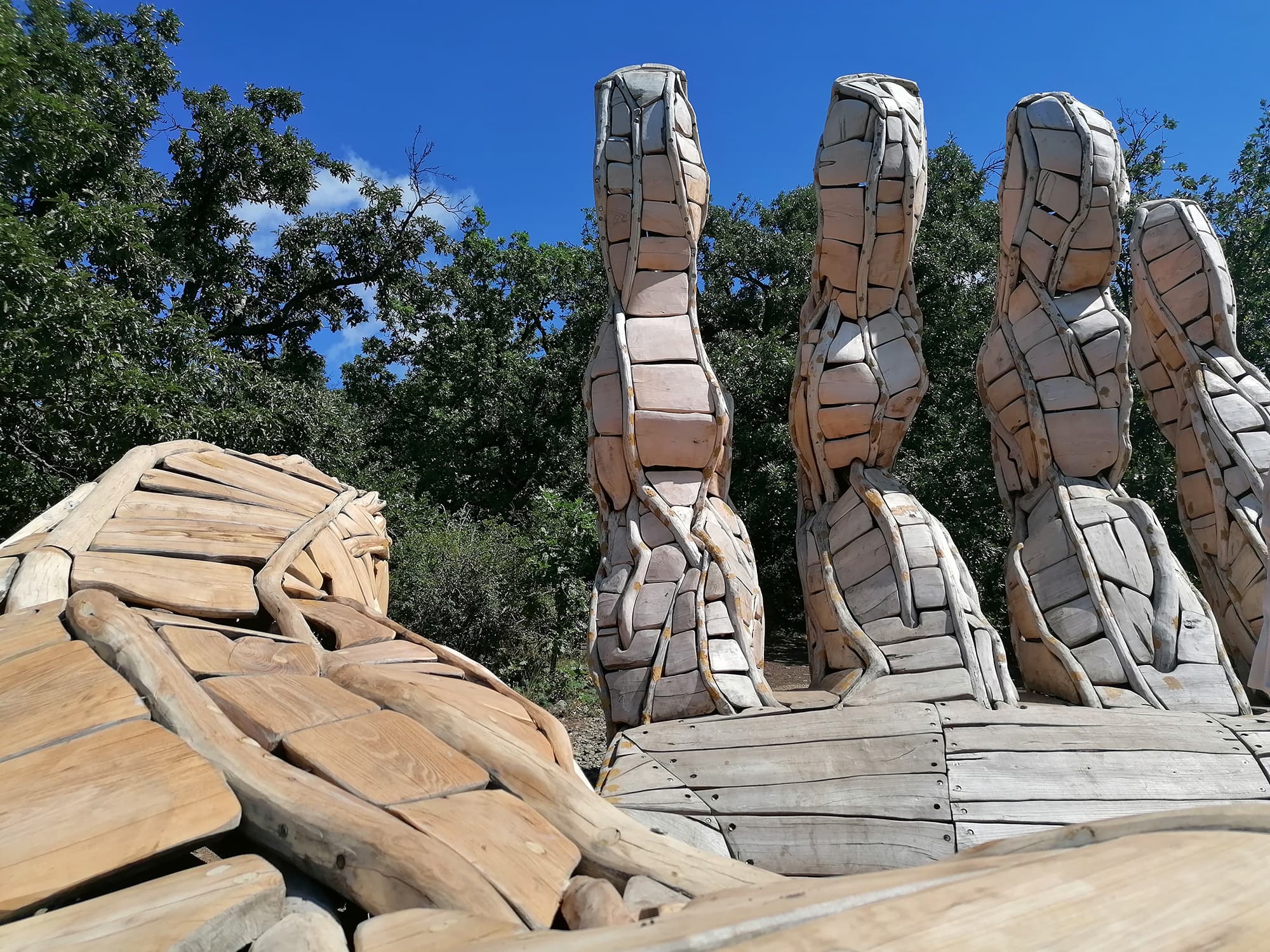 Au-dessus du village se tient le vieux château et une promenade sur la crête de la colline qui nous amène jusqu’à une incroyable main en bois, posée là, en haut de la montagne. Nous y rencontrons un jeune homme parfaitement francophone qui nous explique que l’œuvre a été construite par une famille locale, que ce n’est pas un projet public, de la mairie, de la région ou de l’Europe, mais juste un projet familial. Nous restons un moment à discuter ensemble. Il a vécu plusieurs années à Montpellier pour étudier le russe. Il parle parfaitement français. Puis arrive un petit 4×4, deux hommes sortent du matériel et s’installent. Je demande. Ils ont construit la main l’été dernier mais l’hiver a stoppé leur travail. Il ont encore quelques trucs à finir, des petites réparations, un peu de ponçage avant d’y mettre une dernière couche de lazure. Après les avoir félicité pour la beauté de l’œuvre, nous nous installons à l’ombre pour les regarder travailler un petit moment.