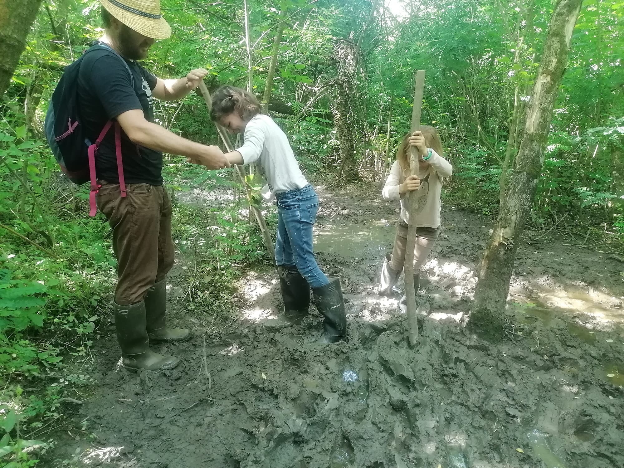 Pendant qu’elle remuait ciel et terre pour nous, l’exploration des marais devait commencer. Un peu de boue, une petite flaque. « Maman, regarde comme je m’enfonce ! » s’amuse Capucine en passant précisément au milieu de la flaque. « Reste sur les bords » lui répond sa rabat-joie de Maman qui a assez d’exploit à gérer pour aujourd’hui. Évidemment, la Capucine n’écoute que son envie et retrouve vite ses grandes bottes taille 43 piégées sous une épaisse couche de boue gluante. Rigolade et sueurs froides. Pierre tire les bottes et sauve l’affaire. Solène elle, pige vite que ses petites bottes n’ont pas la même hauteur et qu’elle pourrait se retrouver dans la boue jusqu’à la taille. Alors nous rasons les bords quitte à se frayer un chemin dans la jungle. Quand il y a trop d’eau, les concepteurs de ce chemin magique ont eu la gentillesse de nous installer deux petites planches au milieu. Quand elles ne sont pas elles-mêmes immergées. Nous voulions explorer un marécage ? Nous nous en souviendrons.